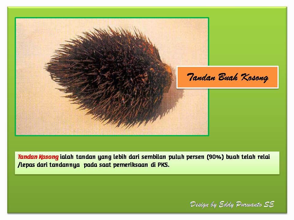 Kelapa sawit adalah tanaman sejenis palma berakar serabut atau monokotil.Bagian tanaman yang bernilai ekonomis adalah buah.Buah tersusun dalam sebuah tandan dan disebut TBS (Tandan Buah Segar).Satu tandan tanaman dewasa beratnya mencapai 20–35 kg,bahkan ada yang mencapai diatas 40 kg,tergantung pada perawatan dan pemupukan tanaman .Tandan tersusun dari 200 – 600 buah @ 20–35 gram.Buah diambil minyaknya dengan hasil :Sabut (daging buah / mesocarp) menghasilkan minyak kasar (CPO) 20–26%Inti sawit sebanyak 6 % yang menghasilkan minyak inti (PKO) 3–4%Kadar % dihitung dari berat tandan buah segar .